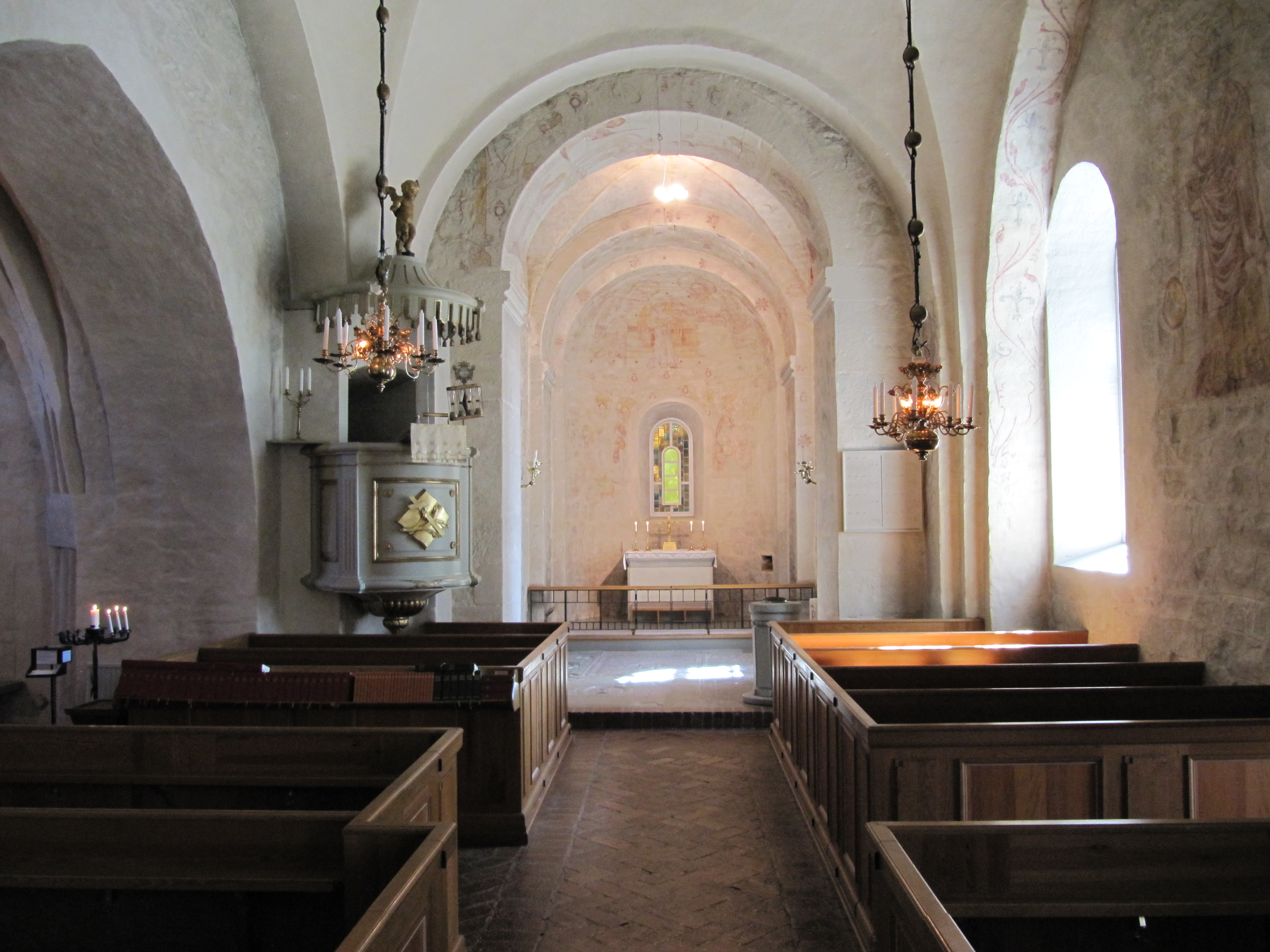 Wnętrze kościoła zostało pomalowane w 1. połowie XV w., przed połączeniem sklepienia w jedno. Ok. 1475 r. kościół pomalowano na nowo. Piętnastowieczna polichromia została zniszczone przez kolejne pożary. Zachowały się jedynie niewielkie fragmenty. W kaplicy północnej można zobaczyć fragmenty zachowanej najstarszej polichromii z XIV w. Zachowała się także płyta nagrobna Cecili Haraldsdotter (Gren) z XV w.