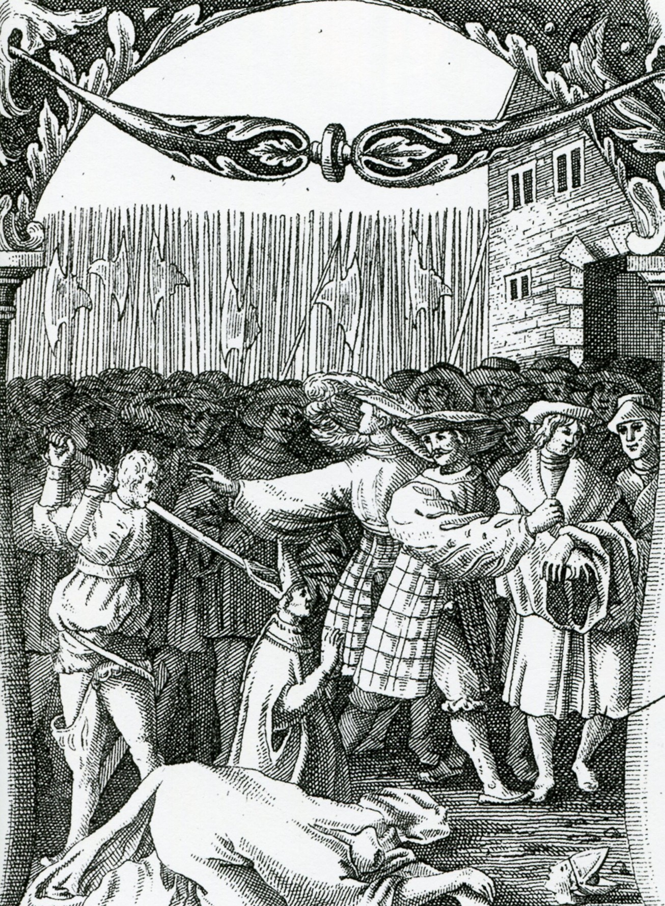 Blodbadstavlan, niezachowany oryginał przedstawiający wydarzenia „krwawej łaźni” powstał jako drzeworyt w 1524 r. w Antwerpii na zamówienie Gustawa Wazy. Na zdjęciu zachowany miedzioryt z 1676 r. (Wikimedia Commons)