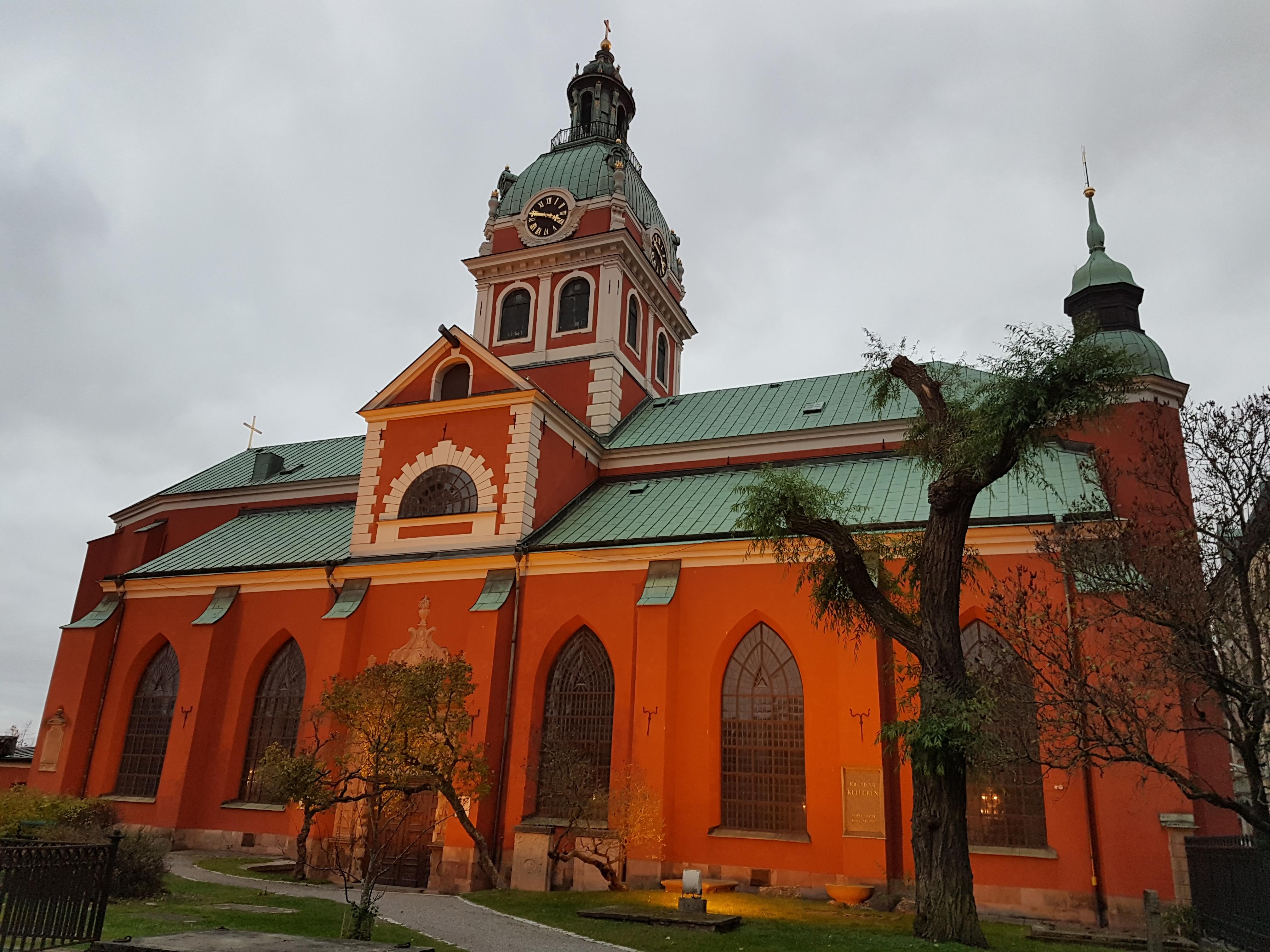 | Zbudowany w 1643 r. trójnawowy kościół halowy, z elementami architektury późnogotyckiej, renesansowej i barokowej o charakterystycznym czerwonym kolorze elewacji. Jest położony w centrum Sztokholmu (kwartał Lantmätaren 2, Norrmalm, gmina Sztokholm, Stockholms län, Uppland) przy Västra Trädgårdsgatan 2/Jakobs torg. 🌐 |