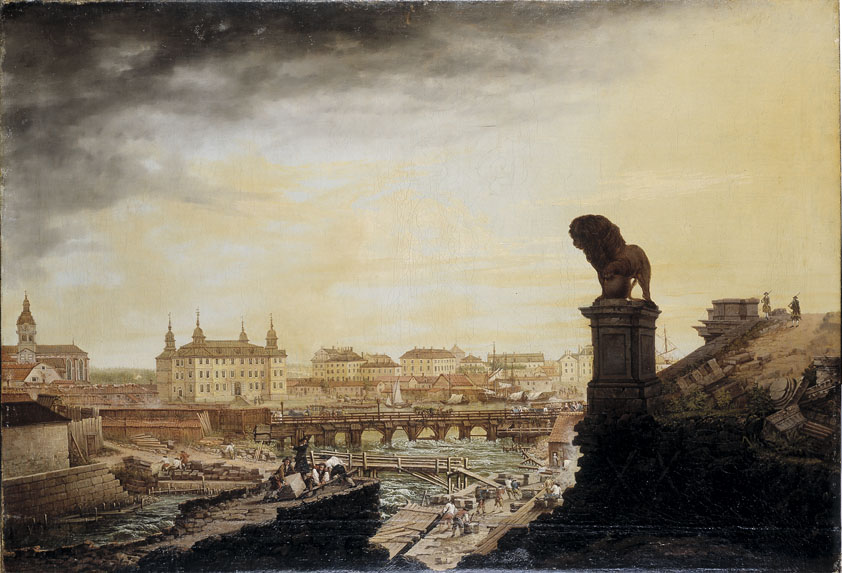 - Widok z obecnego Mynttorget (kościół św. Jakuba po lewej; na prawo od niego niezachowany pałac Makalös), mal. Johan Sevenbom, 1767 r. (Wikimedia Commons)