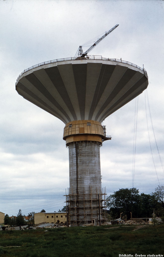 Przy wznoszeniu wieży wykorzystano nowatorskie na tamte czasy technologie. Pierwsze prace rozpoczęto wiosną 1955 r. Fundamenty posadowiono w granitowej skale, wysadzając ją na głębokość 10 m. Dodatkowe wzmocnienia wpuszczono na kolejne 20-30 m w głąb podłoża. Następnie na ziemi odlano betonowy „kapelusz” (zbiornik), który w kolejnym etapie został wywindowany za pomocą 32 hydraulicznych podnośników. Prace związane z podnoszeniem nad ziemię ważącego 3200 ton zbiornika o średnicy 45 m i 146 m w obwodzie rozpoczęto w październiku 1956 r. Jednocześnie pod windowanym „kapeluszem” odlewano betonowy trzon. Na wiosnę 1957 r. roboty były gotowe – osadzona na odlanej podstawie konstrukcja zbiornika znalazła się 33 m nad ziemią. W grudniu 1957 r. Svampen, nazwany tak przez mieszkańców Örebro, zaczął pełnić swoją rolę jako wieża ciśnień, ale uroczyste otwarcie restauracji i punktu widokowego na jej szczycie opóźniło się o kilka miesięcy ze względu na problemy z maszynerią wind i nastąpiło dopiero w maju 1958 r. Budowlę zwieńczyła iglica masztu telewizyjnego. Cała inwestycja kosztowała 3,5–3,7 miliona koron (około 40-45 milionów w dzisiejszej wartości).